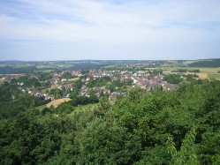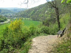 Hinter dem Parkplatz am Zülpicher Tor geht rechts unser Wanderweg weiter. Hier hatte man, um die Bedeutung der Stadt als Kur- und Fremdenverkehrsort anzuheben,. einen kleinen Kurpark angelegt. Nideggen durfte sich sogar ab 1. August 1929 bis 1945 mit dem Zusatz „Bad“ schmücken. An einen Wegestern mit verschiedenen Markierungen (Nideggen Süd, 317m ü.NN) folgen wir dem „Erlebnisentdeckungspfad“, der „Buntsandsteinroute“ und der Nr.2 nach links. An der nächsten Wegegabelung wandern wir links weiter und erreichen die Jugendherberge von Nideggen. Hier führt uns rechts die Nr.2 weiter. An einer Informationstafel macht uns das Schild „Eifel Blick“ neugierig und weist uns nach rechts. Nach 100m finden wir auf der „Effelsley“ eine Schutzhütte mit einem gigantischen Ausblick. In südwest- bis nordwestlicher Richtung bietet sich ein Blick auf die nördlichen Ausläufer des Nationalpark Eifel, ins Rurtal und darüber hinaus bis auf die Hochfläche der Rureifel. Die Burg Nideggen thront rechts über dem Tal auf einer bis zu 50m hohen Felswand.Weiter rurabwärts heben sich die roten Wände der "Christinenley"aus dem Grün des Waldes ab. Im Rurtal liegen die Orte Brück und weiter hinten Zerkall,. Darüber erhebt sich die Kuppe des Burgberges (Bild oben). Burgberg s. auch Rund um den Stausee Obermaubach.
