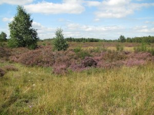 Wer Glück hat kann vielleicht auch in einer der Pfützen wie auf dem Bild oben eine Ringelnatter entdecken, die ihren Kopf aus dem Wasser streckt. Auf einem großen freien Platz steht am Rand ein Schild mit der Aufschrift Ruhezone, die man mit der hier stehenden Bank wörtlich nehmen kann. Wir verlassen die graue Markierung und folgen links der hell- und dunkelblauen Farbe. Hinter einem Holzsteg kommen wir wieder in die offene Heidelandschaft. An der nächsten Wegegabelung führt uns links dunkelblau und schwarz durch eine Landschaft mit Heidekraut in Gesellschaft mit Ginster, Brombeersträucher, Birken und vielen anderen Sträuchern zu einem kleinen Aussichtshügel.