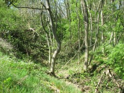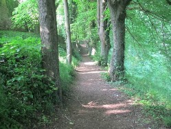 Mit einem von rechts kommenden Waldweg wandern wir geradeaus bergab bis zu einer Wegekreuzung und erreichen dort den Ortsrand von Leversbach. Das erste Haus können wir durch das Laubwerk zwar schon erkennen, folgen aber hier links dem Weg, der wieder mit „17“ markiert ist. Das Gelände zu unserer Linken ist stark kupiert und zeugt von dem ehemaligen Bergbau, der hier einst erfolgte.