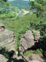 In der nächsten Linkskurve liegt der nächste rechts. Bedrohlich ragt der Hinkelstein Nr.2 (Nummerierung erfolgt entgegengesetzt) in den Himmel und ragt über den Weg hinaus. Dieser Hinkelstein hat eine Kletterroute sogar mit dem Schwierigkeitsgrad 10 aufzuweisen. Die Oberfläche der Felsen wird bei Bergsteigern gern auch als Kartoffelacker bezeichnet. Einige Meter weiter nehmen wir den schmalen rechts abgehenden Pfad ohne Markierung bergan und halten uns im weiteren Verlauf rechts. Oben geht es dann links auf einem breiten Forstweg weiter bis zu einer Straße, von der wir links auch schon unseren Ausgangspunkt sehen.