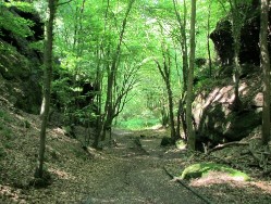 Weiter geht unsere Wanderung Richtung „Eugenienstein 1,5km“. Immer wieder erleben wir Blicke zum Staubecken mit Obermaubach und der darüber liegenden kleinen Ortschaft Bogheim. Außer Vogelgezwitscher dringt hier nur gelegentlich das Signal der Rurtalbahn, die als einzige Verkehrsverbindung das Tal durchfährt, zu uns hinauf. An der nächsten Wegekreuzung gehen wir geradeaus Richtung Nideggen und erreichen nach 600m den Abzweig zum „Eugenienstein“ (244m). Diese, erst nach einem steilen alpinen Aufstieg sich bietende schwindelerregende Aussicht, lassen wir heute aber links liegen und folgen weiter dem breiten Weg (07). Unterwegs gesellt sich ein aus dem Tal kommender Weg hinzu. Eine frei liegende Felswand am linken Wegesrand zeigt, dass im Rurtal zwei unterschiedliche Gesteinsformationen aufeinander treffen. Beim Blick in den linken Hang sehen wir große mächtige Felsen, die dem Anschein nach nur von Bäumen am Absturz gehindert werden. Links liegt eine kleine gefasste Quelle, an der man sich erfrischen kann. Dann führt der Weg direkt an steil aufragenden Felsen vorbei. Es ist einer der 4 Hinkelsteine, die hier das Herz der Kletterer noch erfreut, denn seit 1994 gilt an den meisten Felsen im Rurtal Kletterverbot. Dieter Siegers, Bergsteiger und Autor von Wanderführern, war es, der in den 70 Jahren diese Felsen entdeckte, erschloss und ihnen den Namen gab, der aber beim Eifelwanderer in Bezug auf die vor ihm aufragenden Felsen skeptisches Erstaunen auslöst, da sie ihn ganz und gar nicht an Hinkelsteine seiner Jugendzeit erinnern. Wahrscheinlich waren sie in Siegers Bergsteiger Repertoire wirklich nur Hinkelsteine.