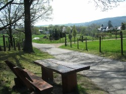 Wir überqueren also die Bahnstrecke und folgen dem Eifelvereinszeichen 4, dem „Josef Schrammweg“ bzw. der „Buntsandsteinroute, die beide von Nideggen kommen. Der asphaltierte „Weißdornweg“ führt entlang der Eisenbahntrasse und endet erst hinter dem letzten Haus (Nr.38). Leicht steigt der Wald- und Wiesenweg bergan bis wir nach einer Wegschleife auf einem Pfad über Wurzeln und Treppen abwärts zur Rur wandern, wo ein idyllisch gelegener Rastplatz zu einer Pause einlädt (7,2km, 212m).
