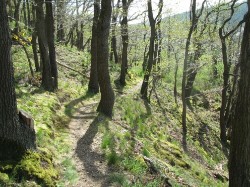 In dieser dörflichen Atmosphäre legen wir eine Rast ein. Weiter führt uns die Wanderung mit dem Pfad (62) gegenüber der kleinen Kapelle zunächst einige Meter abwärts bis zu einem Weg, dem wir links folgen. Der wunderschöne Pfad steigt langsam durch einen urigen Laubwald an. Dann finden wir rechts eine Steinsäule mit der Aufschrift „Pfarrer Stoffels Pfad“. Diesem wohl schönsten Wanderpfad der Region folgen wir mit einiger Vorsicht, denn er schlängelt sich durch einen steil abfallenden Berghang, in dem unterhalb senkrechte Felsbastionen aufragen. Sie grenzen das Rurtal als Eckpfeiler ab.