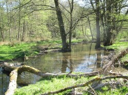 Die Straße führt um den Weinberg herum weiter bergan. Die Straße „In den Weinbergen“ wird gequert, auch sie erinnert an die ehemalige Weinbautradition. Weiter geradeaus stoßen wir auf eine Ortsstraße, wo einige Meter rechts ein unbefestigter Weg zwischen zwei Grundstücken links bis zum „Fasanenweg“ führt. Hier gehen wir zunächst links um nach wenigen Metern rechts erst über Treppen zur Straße „Auf dem Fußberg“ abzusteigen. Links verlassen wir dann nach ca. 100m Obermaubach und wandern auf dem Feldweg mit der „73“ geradeaus. Wir folgen hier dem rechts zu Tal fließenden kleinen Rinnebach. An dem naturbelassenen Bach sind Spuren sichtbar, die nach über hundert Jahren Abwesenheit wieder auf einen Biber hindeuten.
