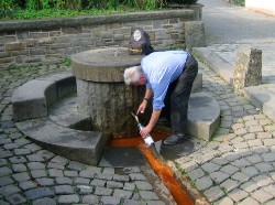 In der eingefassten Mineralquelle kann man kleine Blasen aufsteigen sehen. Sie sind ein Zeichen von vulkanischer Tätigkeit in der Erdkruste. In der Tiefe gibt es noch Magmakörper, die beim Erkalten Kohlendioxidgas abgeben, das in Spalten und Klüften nach oben steigt. Es tritt direkt als Gas aus oder meist gelangt es ins Grundwasser, wird dort gelöst und kommt als Kohlensäure in Quellen an die Oberfläche. Wenn mehr als 1g Kohlendioxid im Kilogramm Wasser gelöst sind, nennt man dieses einen Säuerling oder Sauerbrunnen. Das untere und mittlere Brohltal sowie seine Seitentäler sind so reich an Kohlesäurequellen wie kaum eine andere Gegend in Mitteleuropa. Mit dem Kohlendioxid können die Wässer auch Eisenverbindungen in gelöster Form transportieren. Entweicht die Kohlensäure fällt das Eisen als Hydroxid aus und hinterlässt eine rostrote Färbung. Als kleines Rinnsal läuft der Bach 400m talwärts, bis er von einer erneuten Mineralquelle Nachschub bekommt. Sie wird auch Römerquelle genannt, weil man im Umfeld römische Münzen aus dem Jahre 76 n.Chr. gefunden hat. Auf einem sehr schönen Waldweg wandern wir talabwärts. Am Wegesrand entdecken wir im Berghang einen Stolleneingang, der mit einem Gitter verschlossen ist. Hier befand sich im 19.Jh. ein Bergwerk, das einen 1,5m breiten Erzgang abbaute. Der Gang führte Brauneisenstein. In Drusen eingeschlossen fanden sich büschelförmiges Malachit, Kupferglanz, Kupferlasurkristalle und gediegenes Kupfer. Es wurden 2 Schächte mit einer Teufe von 10 m bis 12 m abgeteuft und anschließend ein Stollen auf diese Schächte in den Berg getrieben. Der Stollen ist heute verschlossen und teilweise eingefallen. Er dient Fledermäusen als Winterquartier.