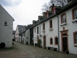 Dieser Name entstand, als 1464 die Konzession zur Errichtung einer Eisenhütte erteilt wurde. Jahrhunderte lang wurden hier Stubenöfen, Brandroste und Takenplatten von hoher Qualität hergestellt. Mitte des 19. Jhs. kam wegen fehlender Transportmöglichkeiten das Ende der Eisenhütte. Vor der Kyll biegen wir rechts ab und erreichen eine uralte bruchsteingemauerte Bogenbrücke (7,4km, 480m), die mit dem weißen Kapellchen im Hintergrund ein zauberhaft reizendes Bachidyll darstellt und deshalb gern auf Fotos festgehalten wird. Die Brigidakapelle, wie sie genannt wird, wurde 1734 erbaut. Nach einem kurzen Besuch in der Kapelle, wandern wir zur Bundesstraße, wo wir an der Ampel die Straße queren und nun noch einmal ins Schwitzen geraten. Es geht schließlich steil hinauf zum Burgort Kronenburg. Erst wandern wir an der Straße entlang, dann in einer Linkskehre den schmalen Fahrweg geradeaus bis zu einem Grillplatz. Rechts überqueren wir auf einem Holzsteg einen kleinen Bach, hinter dem wir nach den letzten anstrengenden Höhenmetern einen Parkplatz erreichen (8,3km, 545m). Der Ort liegt auf einem an drei Seiten steil abfallenden Bergkegel und hier im Norden lag ursprünglich der einzige schmale Zugang. Durch das Nordtor betreten wir von den Jahrhunderten scheinbar unberührt die malerische, mittelalterliche Kulisse der Bergfestung. Auf der linken Seite in der vor uns liegenden Gasse sehen wir noch sehr schön nebeneinander die Türen von Wohnhaus und Stall, aus dem bis in die 50er Jahre Kühe hinausgetrieben wurden oder Hühner das Dorf besiedelten. Nur wenige Burgorte, die einst so zahlreich in der Eifel vorhanden waren, sind heute noch in diesem Zustand erhalten. Schon nach wenigen Metern biegen wir rechts ab und finden eine Reihe renovierter Häuser vor, die den Ort nach Westen hin begrenzen. Links erinnert der Name des Cafes „Zehntscheune“ daran, dass Bauern und Bürger früher dem Grafen den zehnten Teil ihrer Einkünfte abzuliefern hatten. Aber welch faire Abgabe, wenn man daran denkt, welch enorme Steuern unser heutiger Staat von seinen Bürgern einkassiert. Daran möchten wir heute nicht erinnert werden, sondern einen abwechslungsreichen und unterhaltsamen Wandertag verbringen. Dazu schafft eine Einkehr in der gemütlichen „Zehntscheune“ einen zusätzlich köstlichen Beitrag.